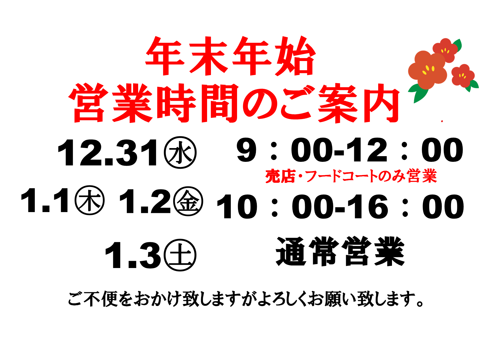 12月31日のみ下記の営業とさせていただきますのでお知らせいたします。